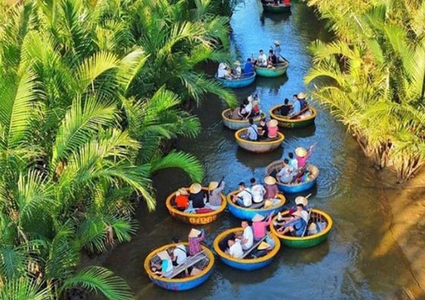14h30: Xe đưa đoàn tham quan khu du lịch rừng dừa Bảy Mẫu bắt đầu của những trải nghiệm tham quan khu sinh thái rừng dừa bằng thuyền thúng. Quý khách cũng có thể tự chèo lái nếu thích. Cảm giác lênh đênh trên sông nước rất tuyệt vời.